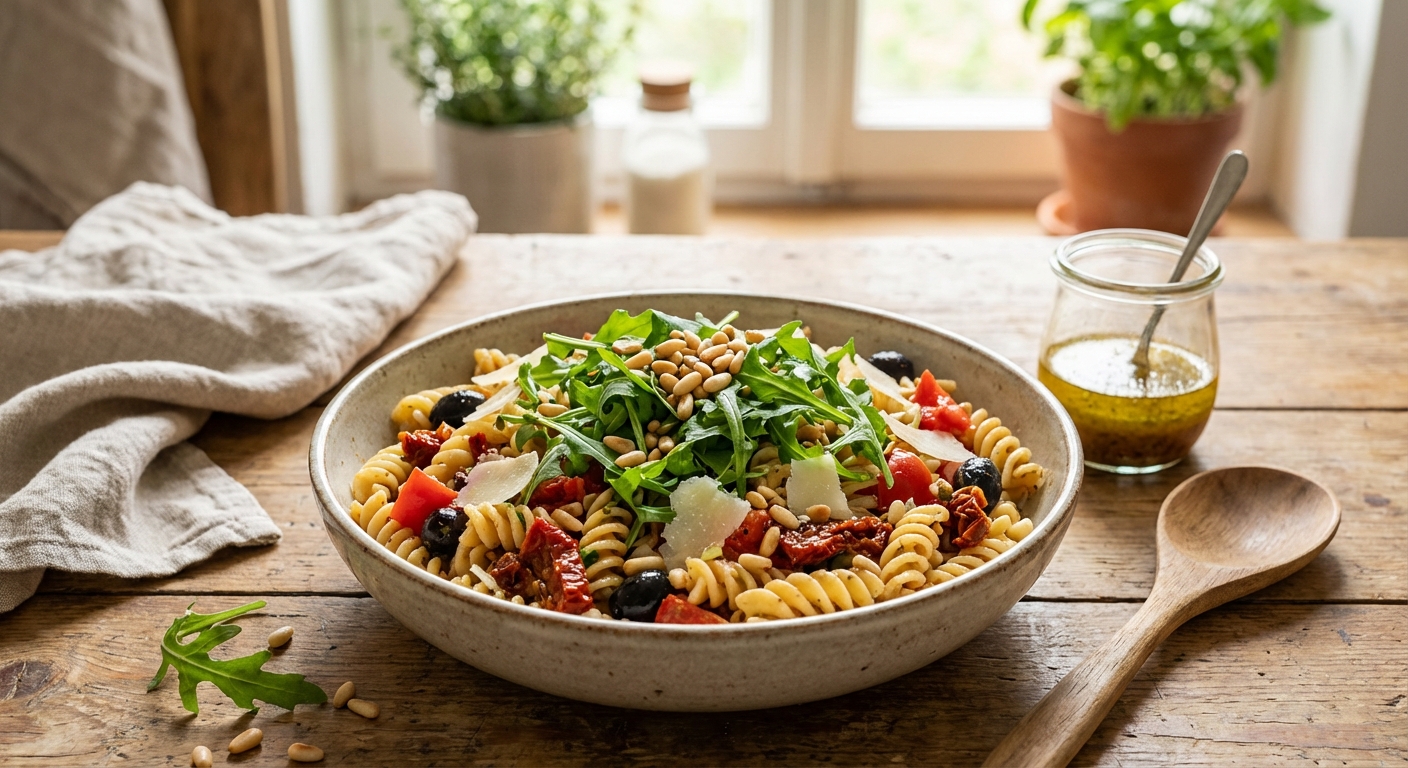 Nudelsalat mit Rucola und getrockneten Tomaten